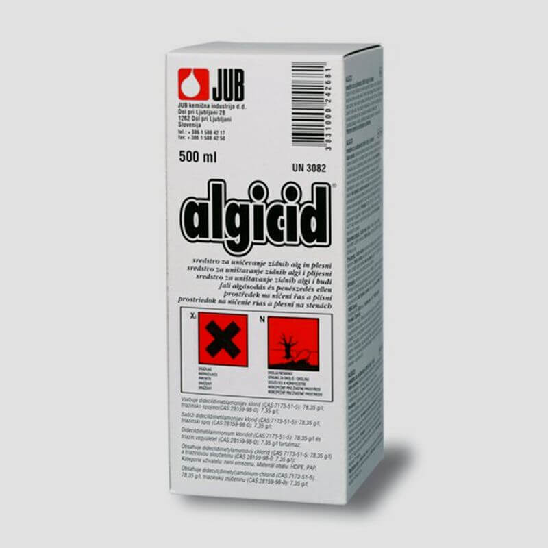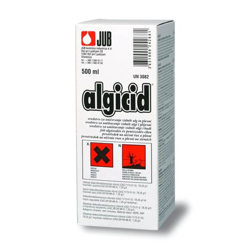 ALGICID Sredstvo protiv plijesni 0,5l JUB je bezbojna alkoholna biocidna otopinal. Duboko penetrira u zidnu podlogu i učinkovito djeluje na širok spektar zidnih algi i plijesni. Upotrebljava se za dezinfekciju fasadnih i unutarnjih zidnih površina obrađenih s premazima i žbukama i za dezinfekciju betona, kamena ili drva. U objektima mesno prerađivačke industrije upotrebljava se kao premaz za uništavanje plijesni. Upotrebljava se kao kurativno sredstvo.