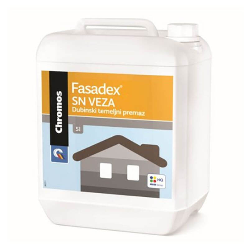Fasadex SN veza 5l od proizvođača CHROMOS dubinski temeljni premaz na osnovi vodene disperzije akrilatnog kopolimera za povećanje prionjivosti novih premaza na starim podlogama, za impregniranje i reguliranje apsorpcije mineralnih i drugih podloga te pripremu podloge prije nanošenja žbuka i disperzijskih boja. Razrjeđuje se čistom vodom u omjeru 1:5.