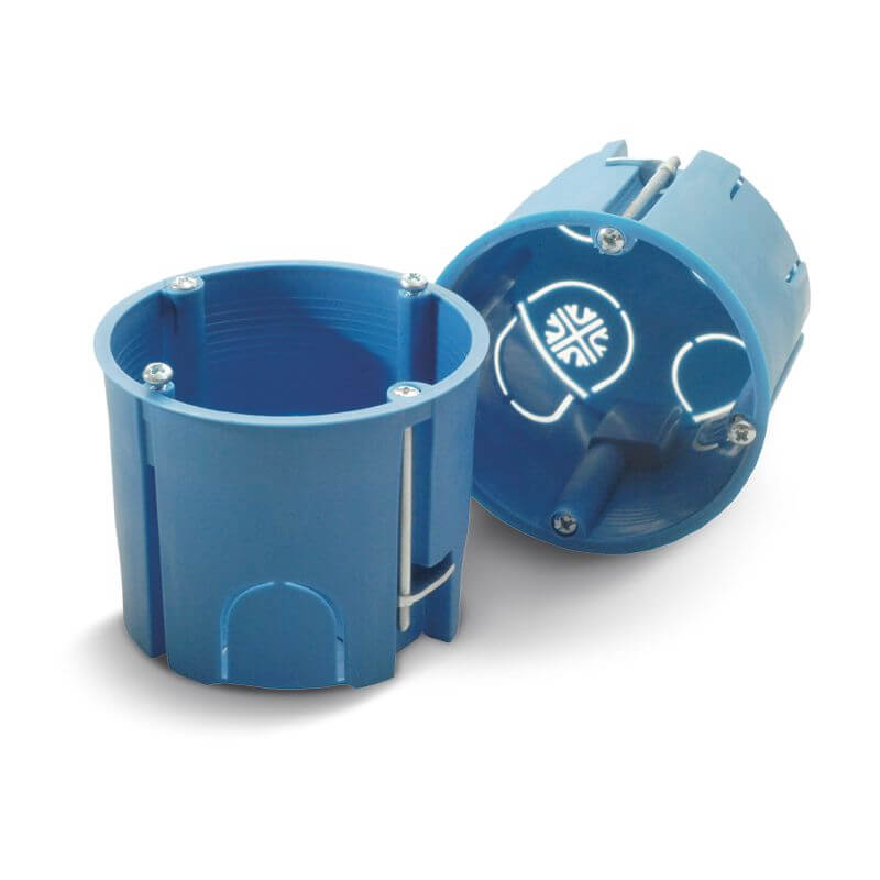 Kutija za šuplji zid Ø68×55 za ugradnju u šuplje zidove promjera 68 mm i dubine 55 mm, plave boje. Koristi se u suhomontažnim konstrukcijama, kao što su gipskartonski zidovi ili stropovi.