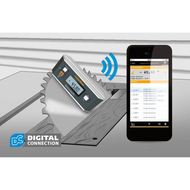 Libela digitalna MasterLevel Compact Plus LASERLINER idealna je za precizno poravnavanje nagiba. Ima prikaz kuta od 360° i referentnu funkciju za prijenos kutova. Zaslon se automatski okreće prilikom mjerenja iznad glave i stoga je lako čitljiv u bilo kojem položaju. Funkcija zadržavanja omogućuje zadržavanje prethodno određene vrijednosti na zaslonu. Mjerenja se mogu jednostavno prenijeti na pametni telefon pomoću sučelja Digital Connection. Visoka točnost mjerenja osigurava se funkcijom kalibracije. Jaki magneti osiguravaju sigurno postavljanje na metalne površine.