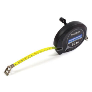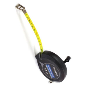 Mjerna traka 30m od proizvođača PROTECH – čelična traka s fleksibilnim vrhom spriječava ranu koroziju i pucanje. Dodatno ojačana konstrukcija sa izdržljivim ABS okvirom štiti od udara i pucanja. 1 okret ručke = 6 okreta od koluta za brže premotavanje. Poklopac od najlonskog premaza – smanjuje habanje. Najlonski premaz otporan na hrđu pokriva cijelu površinu oštrice osiguravajući dugotrajnu čitljivost i izdržljivost. Materijal: ABS plastika.