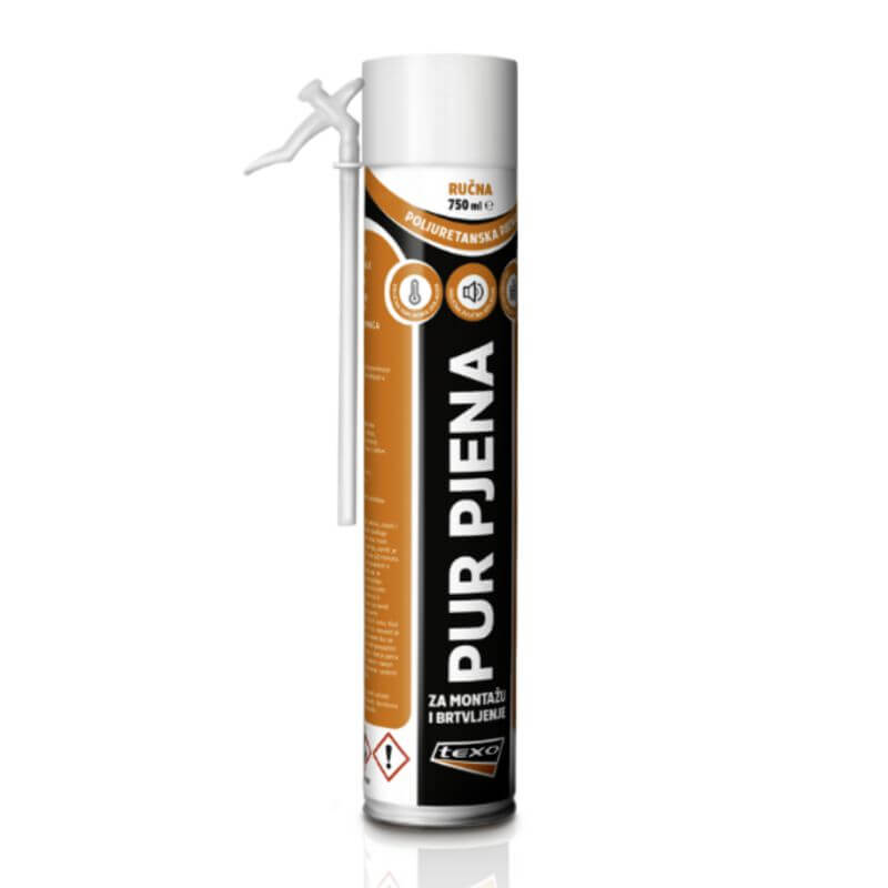 PUR pjena obična ručna 750ml TEXO je jednokomponentna poliuretanska pjena koja stvrdnjuje u doticaju s vlagom iz zraka.