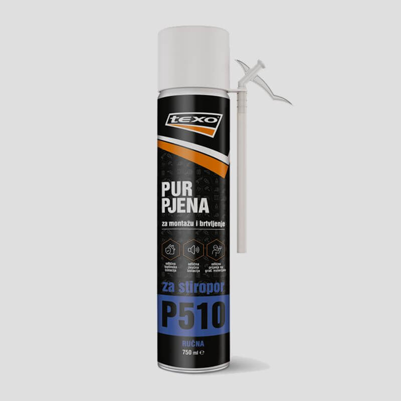 PUR pjena za stiropor ručna 750ml TEXO je poliuretansko samoekspandirajuće ljepilo za stiropor. Namjenjeno za lijepljenje ploča od polistirolne tvrde pjene kao perimetarske izolacije te izolacijskih i drenažnih elemenata. Prijanja na sve uobičajene građevinske podloge kao što su beton, zid, kamen, žbuka, drvo, metal polistirol, premazane bitumenske trake i debeli hladni bitumenski namazi.