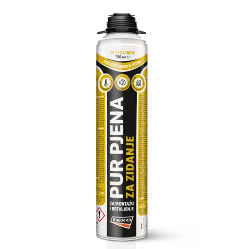 PUR pjena za zidanje pištoljska 750ml TEXO je jednokomponentno poliuretansko ljepilo niske ekspanzije. Razvijeno za brzo i pouzdano zidanje te montažu fasadnih sustava. Stvrdnjava se u prisutnosti vlage i nakon sušenja postaje trajno elastična, vodootporna i otporna na plijesan.