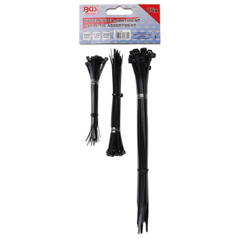 Set vezica 100-200mm od proizvođača BGS je 75-dijelni asortiman univerzalnih plastičnih vezica crne boje, duljine 100, 120 i 200 mm.