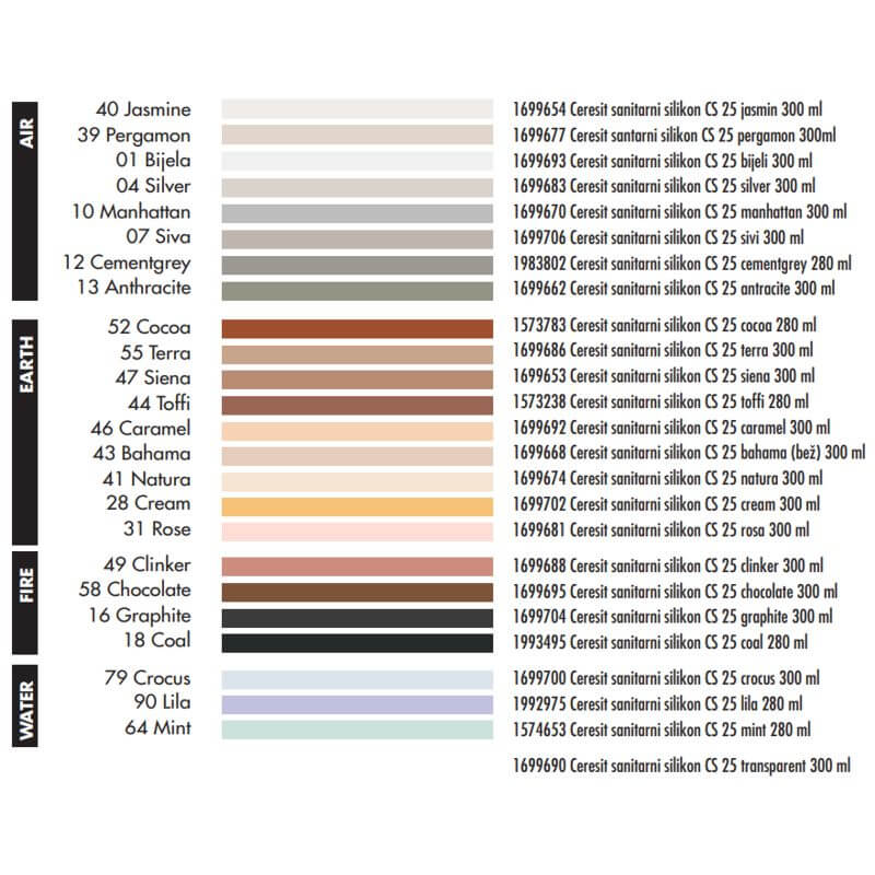 Silikon CS 25 CHOCOLATE 58 CERESIT koristi se za brtvljenje svih rubnih spojeva na zidovima i podnim površinama, te za rubne spojeve sanitarija i opreme u kupaonicama i kuhinjama i ostalim prostorima s povećanom vlagom u zraku. Odlično prianja na brojne podloge kao što su keramika, staklo, emajl, glazirane pločice, plastika (PMMA), aluminij itd. Nije primjeren za nanošenje na metale podložne koroziji, beton, cement, žbuku i prirodan kamen. Silikon je visoko učinkovit za zaštitu protiv plijesni – sadrži aktivne sastojke za zaštitu od plijesni. Visoka otpornost na oštećenja, vruću vodu, UV zrake i temperaturne promjene.
