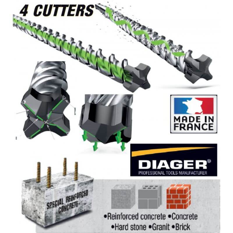 Svrdlo SDS-plus 4G4 10x310mm od francuskog proizvođača DIAGER izrađeno je od visokokvalitetnog legiranog čelika s vrhunskom glavom od volframovog karbida s 4 rezne oštrice. Jamči odlične performanse čak i u najtvrđem armiranom betonu.