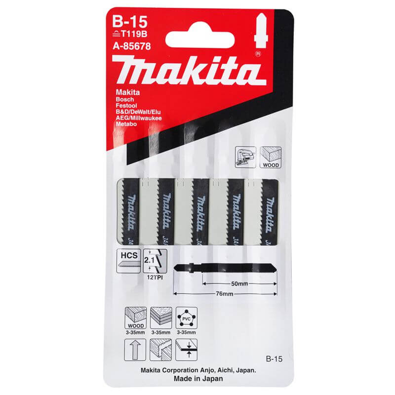 Ubodne pilice B-15 T119B 5/1 od proizvođača MAKITA od visokougljičnog čelika (HCS) namijenjene su za rezanje drva i PVC materijala. Omogućuju precizne rezove s visokim kvalitetom i dugotrajnošću sječiva. Ukupna duljina je 76 mm s radnom duljinom od 50 mm i 12 TPI
