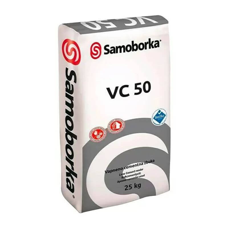 Žbuka VC 50 25kg SAMOBORKA je vapneno-cementna podložna jednoslojna žbuka služi za strojno i ručno žbukanje zidova i stropova, filcane teksture. Namijenjena za unutarnje i vanjske radove.
