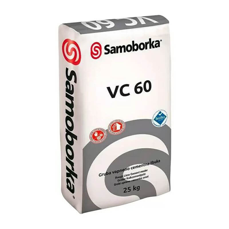 Žbuka VC 60 25kg SAMOBORKA je podložna jednoslojna žbuka koja služi za strojno i ručno žbukanje zidova i stropova, filcane teksture. Namijenjena za unutarnje i vanjske radove.